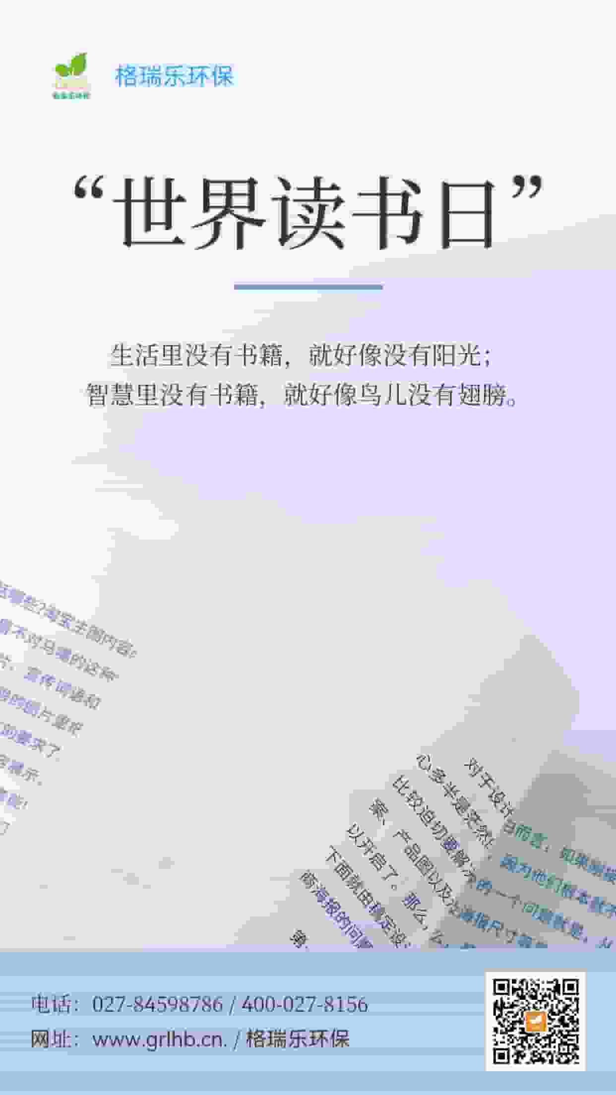 在世界讀書日,讓我們一同翻開環(huán)保的畫卷,邁向綠色的未來!格瑞樂環(huán)保,與你并肩,以智慧呵護我們的地球,使每一幅畫面都展現(xiàn)出環(huán)保的決心與使命,讓我們一起為美好世界而讀!你愿意與格瑞樂環(huán)保一同前行嗎?